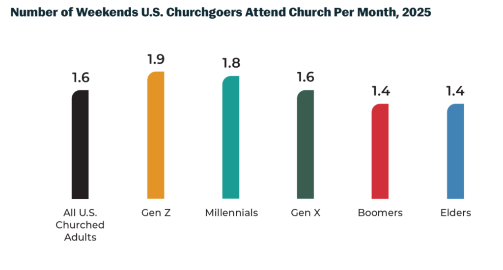 Regardless, for the first time in modern tracking, the youngest generation of church-goers is attending more often than their Elders, reversing the long‑standing pattern where older adults were the most regular attendees. Within the subset of the young Christians who do attend, their average frequency has increased from around once a month (during or just after the pandemic) to almost twice a month.