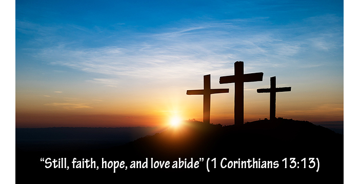 Top image credit: Cross of Christ with sunset background, image from Bigstock.com, © by banphote, stock photo ID: 455541355. Used with permission. Quote from 1 Corinthians 13:13 added.