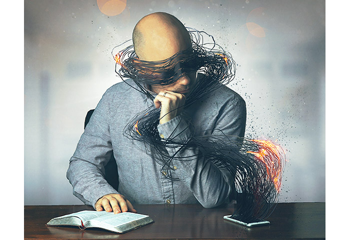 Top image credit: Illustration of a man facing a constant stream of digital distrations while trying to be attentive to God’s word and priorities for his personal life, family, and concern for helping and serving others; stock image from ChristianPhotoshops.com, (c) by Kevin Carden. Used with permission.